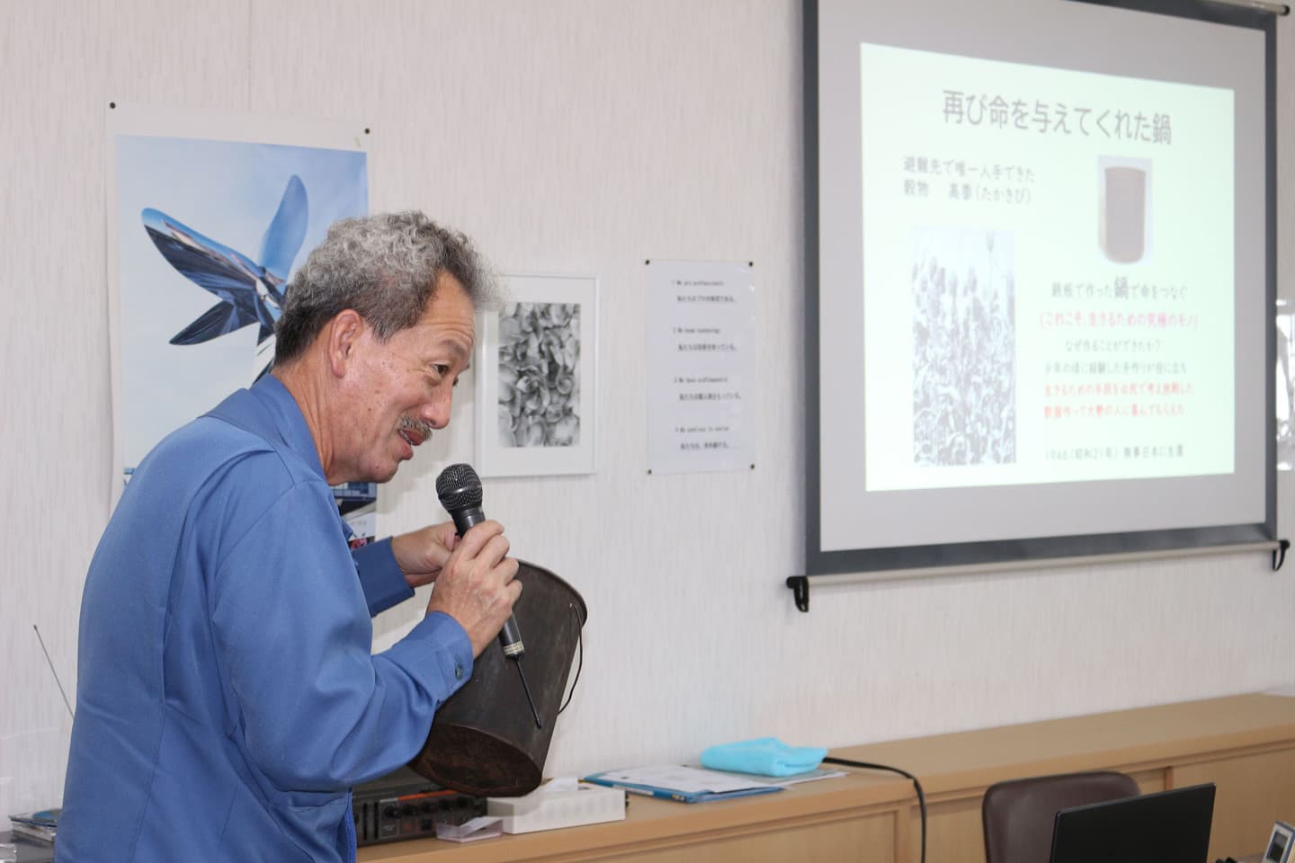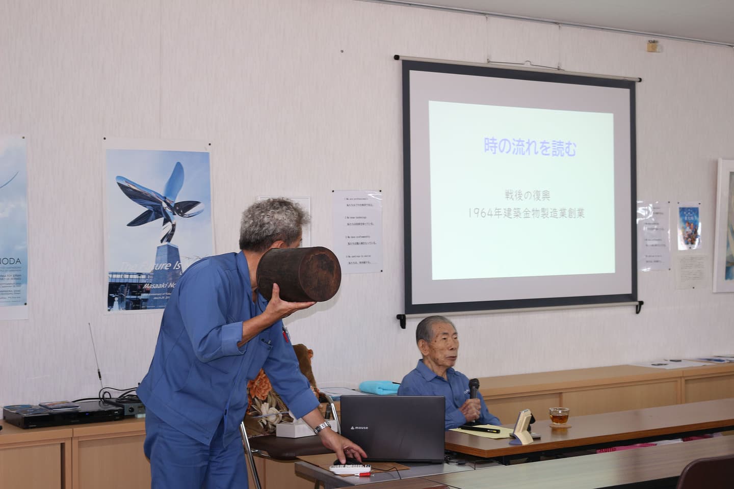 写真に写っている相談役様(創業者で令和6年12月お亡くなりになりました)が、終戦時満州にてソ連に攻め込まれ、帰国できず取り残されたときのことです。(当時17歳)道具のない中、鉄板をたたいて鍋を手作りされ、これで煮炊きをして飢えをしのいだそうです。これを何個か作ってほかの人たちにも使ってもらい、みんなの命をつなぎ大変喜ばれたとのことです。