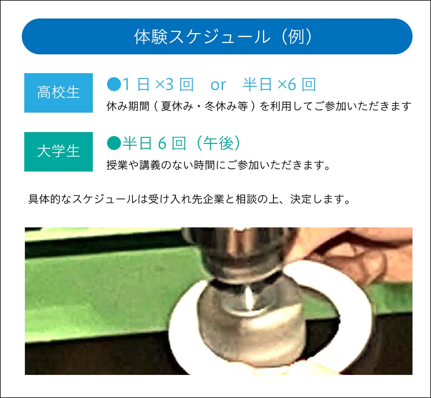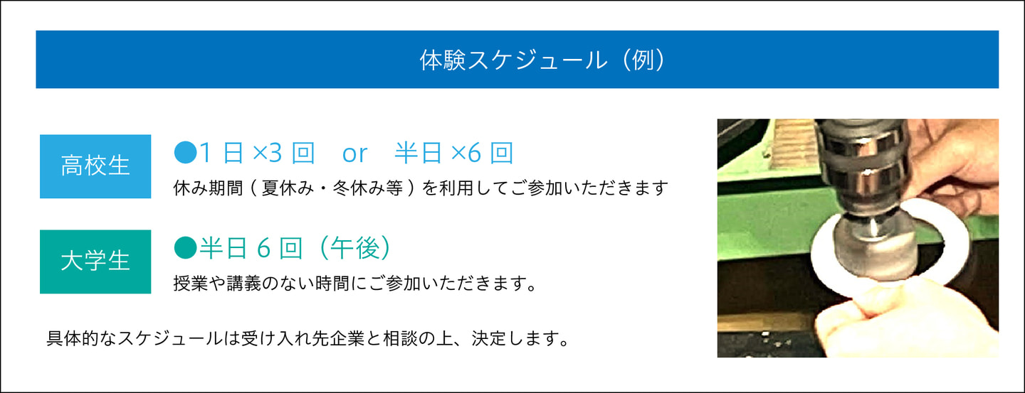 学校では絶対に出来ない体験をしてみませんか。学べることは現場でのモノづくり体験だけではありません。どんなことを体験したいですか? 体験内容は自分の希望を踏まえ企業と相談のうえオーダーメイドできます。ここでの体験は社会に出たときにきっと役立つはず。皆さんの参加をお待ちしています。